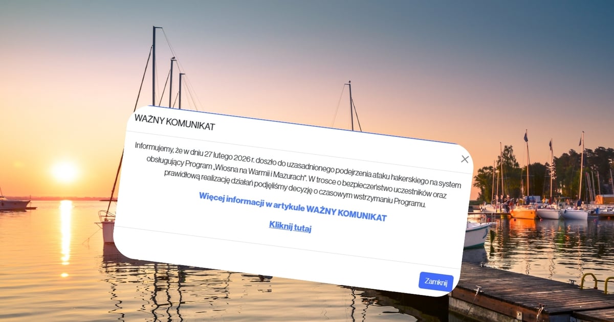 "Informujemy, że w dniu 27 lutego 2026 r. doszło do uzasadnionego podejrzenia ataku hakerskiego na system obsługujący Program Wiosna na Warmii i Mazurach. W trosce o bezpieczeństwo uczestników oraz prawidłową realizację działań podjęliśmy decyzję o czasowym wstrzymaniu Programu" - napisano na stronie bonwarmiaimazury.pl.