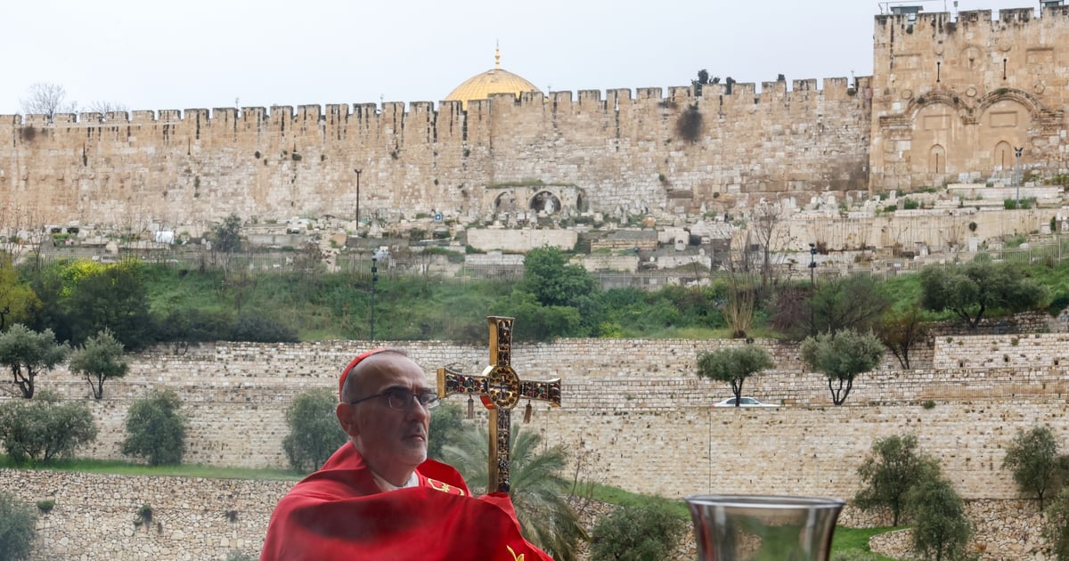 Kardynał Pierbattista Pizzaballa odprawiający w Jerozolimie nabożeństwo z okazji Niedzieli Palmowej (fot. Ammar Awad / POOL / PAP / EPA)