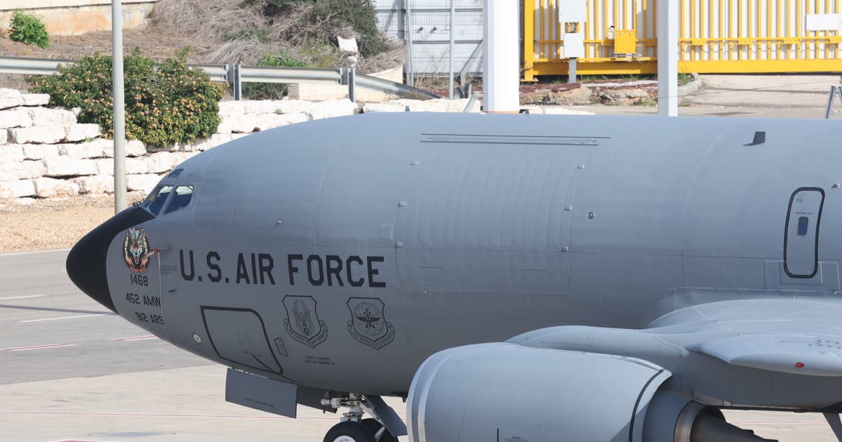 Maszyna Boeing KC-135 Stratotankers amerykańskich sił powietrznych na lotnisku Ben Guriona w Izraelu. (fot. ABIR SULTAN / PAP / EPA)
